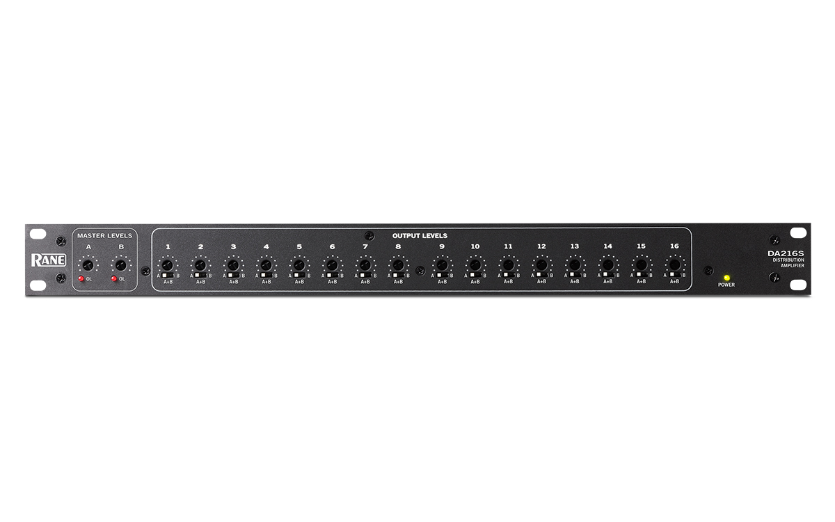 The Rane DA216S Distribution Amplifier is a two-input, sixteen-output splitter/distribution amplifier. The DA216S is capable of providing sixteen discrete balanced outputs from one or two balanced mic-level or line-level inputs. The level of each output is individually adjusted via one of the sixteen screwdriver Output Level controls on the front panel. Each output may be assigned to either or both inputs via front panel accessible slide switches.