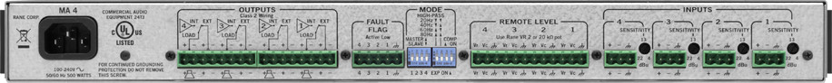 The 100 watt per channel, four-channel MA 4 amplifier achieves unparalleled power density, reliability and features in a space saving 1U, 19 inch rack mount chassis weighing only eight pounds (3.6 kg). A universal-voltage switching power supply provides near perfect Power-Factor, reducing peak currents to ⅓ compared to non power-factor-corrected supplies. A long list of unique features ranging from constant load power to built in automatic redundancy switching to advanced dynamics control, qualify the MA 4 for the most demanding fixed installation applications. The MA 4 excels in music & paging systems, small conference rooms and speech reinforcement applications requiring multiple amplifiers. Advanced dynamics control algorithms adapt to changes in temperature, load impedance and sensitivity setting. The result is a truly plug-and-play amplifier that ensures excellent signal integrity at all times.