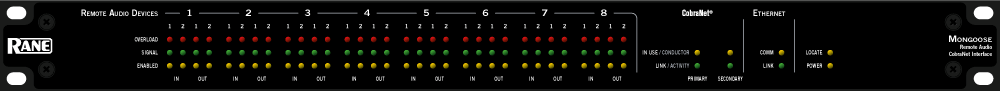A family of RAD models connect to the Mongoose. Each converts analog audio to or from 24-bit, 48 kHz digital audio. Shielded CAT 5e cable and termination transport four digital audio channels – two channels in each direction – as well as power, ground and a communications channel via Rane’s proprietary RAD Network. Status indicators are at the RAD signal entry points, at the front and back of the Mongoose, and in Mongoose Tracker software.