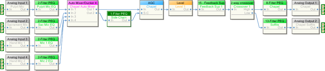 The signal processing flow starts at the Analog Input. A 2-band Parametric Equalizer filters out-of-band low frequencies. The microphone signals are summed together in an Automatic Mixer. An AGC (Automatic Gain Control) reduces the dynamic range and a High-Pass Filter in the side chain improves the performance of the AGC. The Level control can be tied to a pot on the wall or a smart remote. There is a Feedback Suppressor for good measure. A 2-way Crossover supports a biamplified system. The 10-band Parametric Equalizers are utilized for both wide- and narrow-band corrections. Generally, wide-band filters correct minimum-phase frequency response irregularities in the speaker drivers and in the room response. Narrow-band filters are useful to partially correct non-minimum-phase related problems such as energy stored in room modes (reverberant energy). A Limiter could also have been added to protect the system from clipping if that feature is not included in the power amplifier.