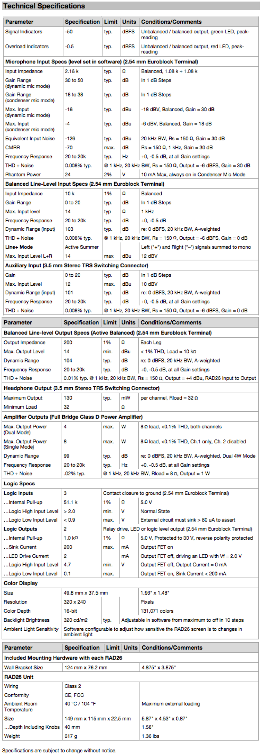 The RAD26 provides any room with end user control via the color LCD display and rotary encoders. It also features a dual universal audio I/O interface, line-level input jacks for local needs, a headphone output, and a dual 4-watt amp all using using one shielded cat5e (or better) cable drop. Three logic closure inputs and three active-low outputs add to the control capabilities. The built-in amplifier powers a small stereo pair of room speakers, or it can be switched in software to power a single 8-watt speaker. The RAD26 provides enough I/O and control to support one room in a HAL audio system which may require…